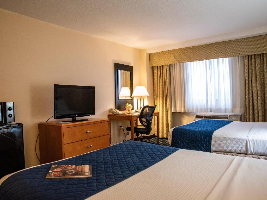 Spacious room incorporating two double beds and dresser for easy storage, phone and tea-coffee maker. Specific amenities also include a writing desk and comfortable chair, flat panel TV with over 80+ Cable channels. A mini fridge and microwave has been added to this traditional two double bed room. Bathrooms provide essentials including hair dryer, granite counter top and shower-tub combination, along with Bath and Body brand works products. Room Amenities: Coffee Maker, Hair Dryer, Cribs (Available Upon Request), Iron/Ironing Board, Microwave, Capital City View, Office Desk with chair, Refrigerator ,River View Roll-a-Way Bed (Available Upon Request)